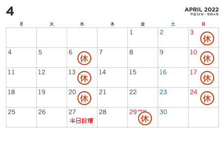 お知らせ 4月の休診日のお知らせ 2022.04.08 当院では下記日程を休診とさせていただきます。あらかじめご了承頂きます様、お願いいたします。 ※4月27日は、29日(祝)の代わりに半日診療します。 Tweet Share Hatena 予防に力をいれてます!勉強や研修会も行ってますので一緒に働きませんか? 前の記事 5月の休診日のお知らせ 次の記事