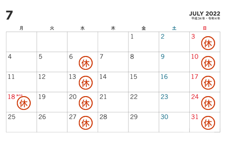 お知らせ 7月の休診日のお知らせ 2022.06.29 当院では下記日程を休診とさせていただきます。あらかじめご了承頂きます様、お願いいたします。 Tweet Share Hatena 6月の休診日のお知らせ 前の記事 8月休診日のお知らせ 次の記事