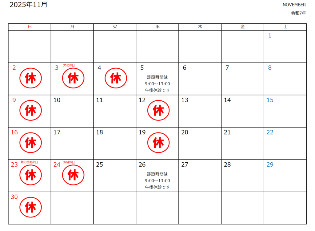 お知らせ 2025年11月休診日のお知らせ 2025.08.31 当院では下記日程を休診とさせていただきます。あらかじめご了承頂きます様、お願いいたします。 Tweet Share Hatena 2025年10月休診日のお知らせ 前の記事 2025年12月休診日のお知らせ 次の記事