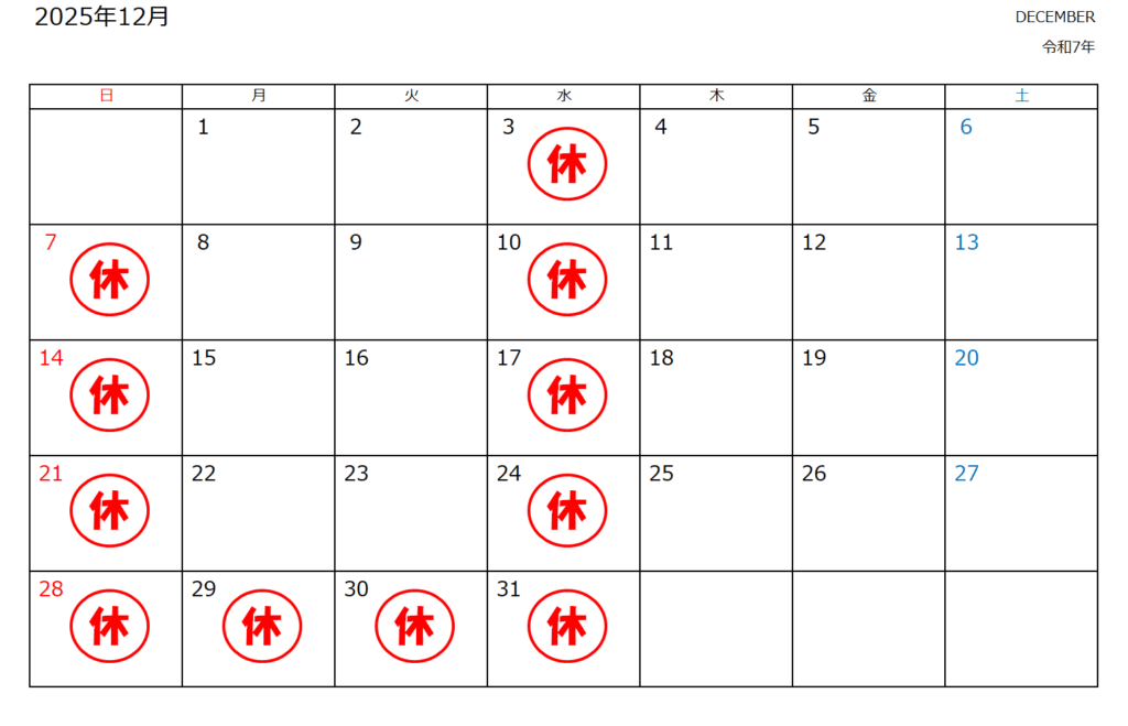 お知らせ 2025年12月休診日のお知らせ 2025.09.30 当院では下記日程を休診とさせていただきます。あらかじめご了承頂きます様、お願いいたします。 Tweet Share Hatena 2025年11月休診日のお知らせ 前の記事 2026年1月休診日のお知らせ 次の記事